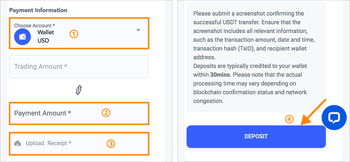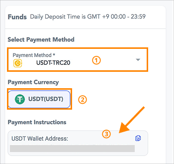 ① Wählen Sie unter „Select Deposit To“ „Wallet USD“ aus.