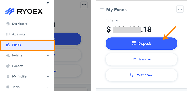 Nach dem Einloggen bei My RYOEX klicken Sie direkt im Dashboard auf „Deposit“ oder navigieren Sie über „Funds Management“ → „Deposit“, um die Einzahlungsseite zu öffnen.