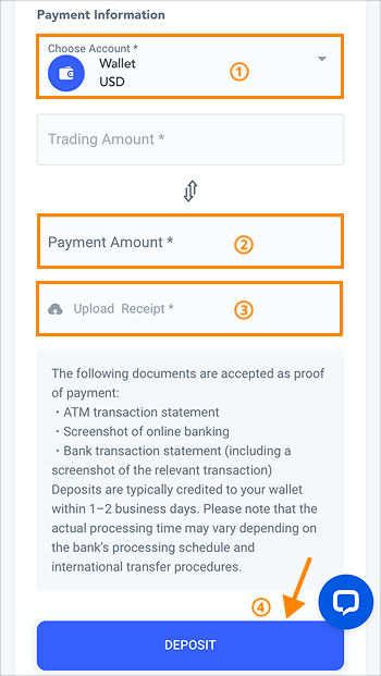 Nachdem Sie die Banküberweisung abgeschlossen haben, kehren Sie zur My RYOEX Einzahlungsseite zurück und führen die folgenden Schritte aus: