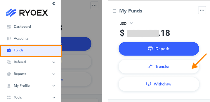 Im My RYOEX Menü klicken Sie auf „Funds Management“ → „Fund Transfer“.