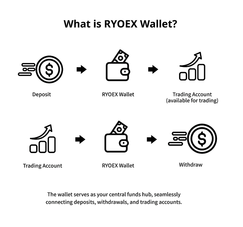 Nachdem Sie Geld per Banküberweisung oder Kryptowährung auf Ihr RYOEX Wallet eingezahlt haben, müssen Sie Gelder von Ihrem Wallet auf Ihr Trading-Konto übertragen, bevor Sie mit dem Handel beginnen können.