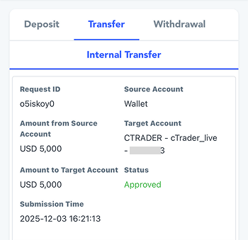 Sobald der Status auf „Approved“ steht, ist die Geldübertragung abgeschlossen. Sie können nun mit dem Handel auf Ihrem gewählten Trading-Konto beginnen.