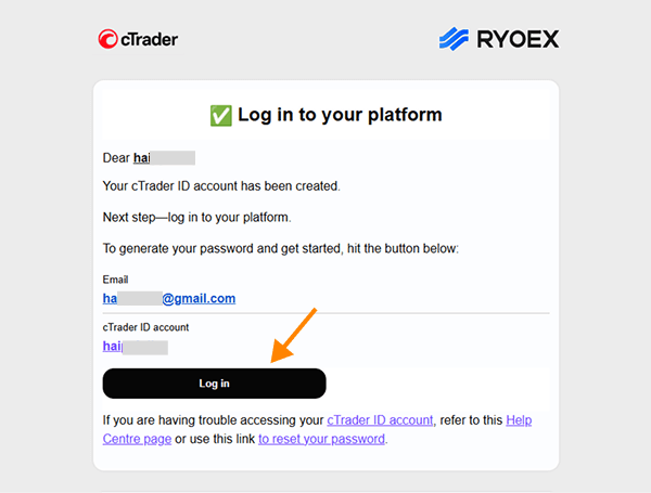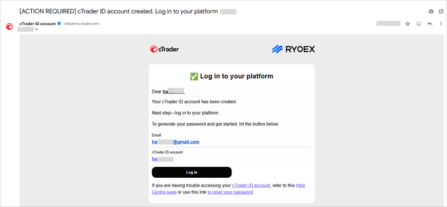 Normalerweise wird, sobald Sie ein cTrader-Handelskonto in My RYOEX eröffnen, sofort eine E-Mail von cTrader mit Anweisungen zum Einrichten Ihrer cTrader ID gesendet.