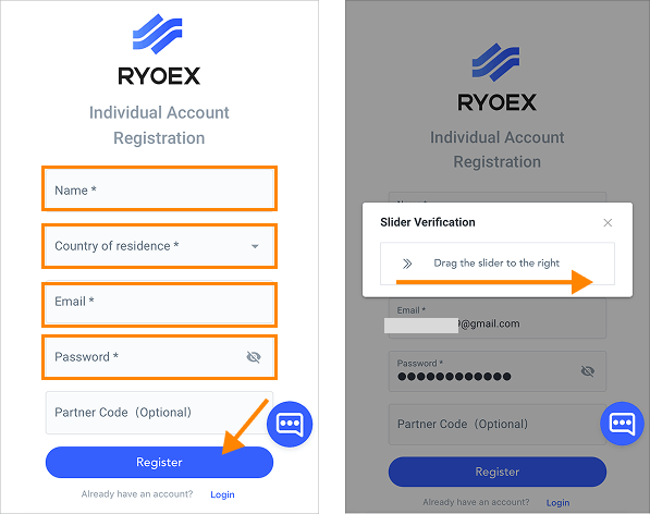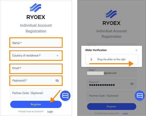 RYOEX Offizielle Website Klicken Sie auf die Schaltfläche „Live-Konto eröffnen“ auf der offiziellen RYOEX-Website oder verwenden Sie den Button unten, um direkt zur Anmeldeseite zu gelangen.Step 2. Geben Sie Ihre persönlichen Informationen ein & schließen Sie die Schieberegler-Verifizierung ab