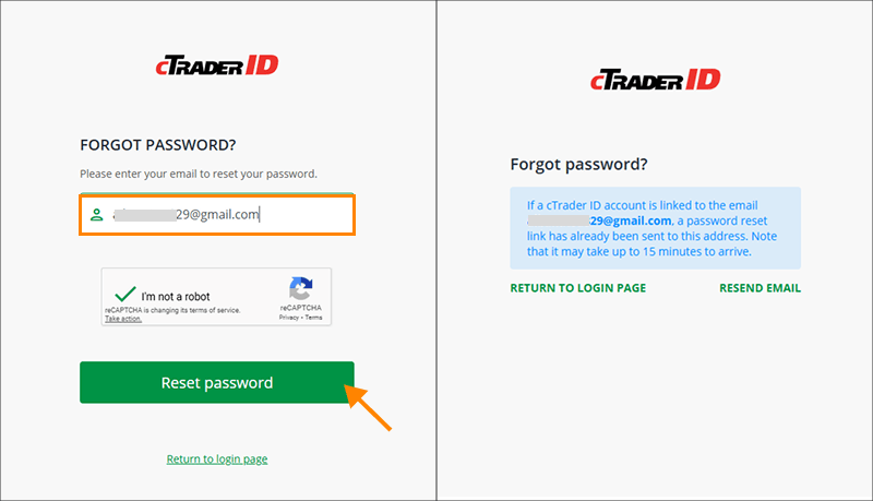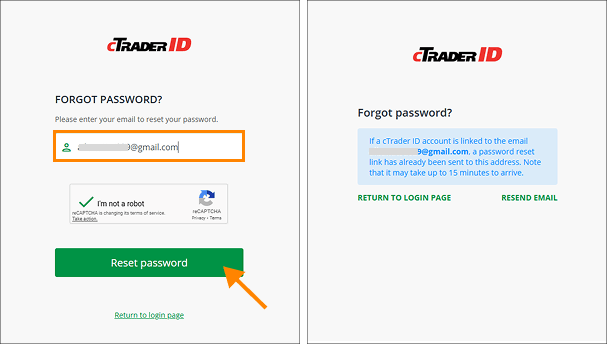 Durch Zurücksetzen Ihres cTrader ID-Passworts können Sie Ihre cTrader ID neu konfigurieren und den Vorgang wie gewohnt fortsetzen.