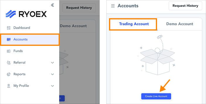Gehen Sie im My RYOEX-Menü auf „Mein Konto“ und klicken Sie auf „Real Account öffnen“.
