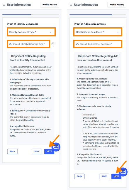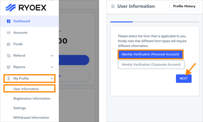 Gehen Sie im My RYOEX-Dashboard zu Persönliche Informationen → Verifizierungsdetails → Identitätsprüfung (Einzelkonto) und klicken Sie auf Weiter. Sie werden dann zur Upload-Seite für Ausweisdokumente weitergeleitet.