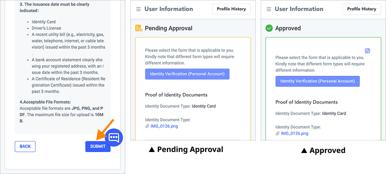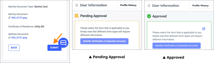 Nach der Genehmigung Ihrer Dokumente ändert sich Ihr Verifizierungsstatus von „Pending Approval“ zu „Verified“ und der KYC-Prozess ist abgeschlossen.