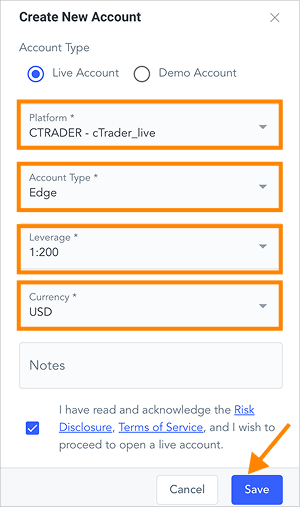 Wählen Sie „CTRADER – cTrader_live“ als Plattform.